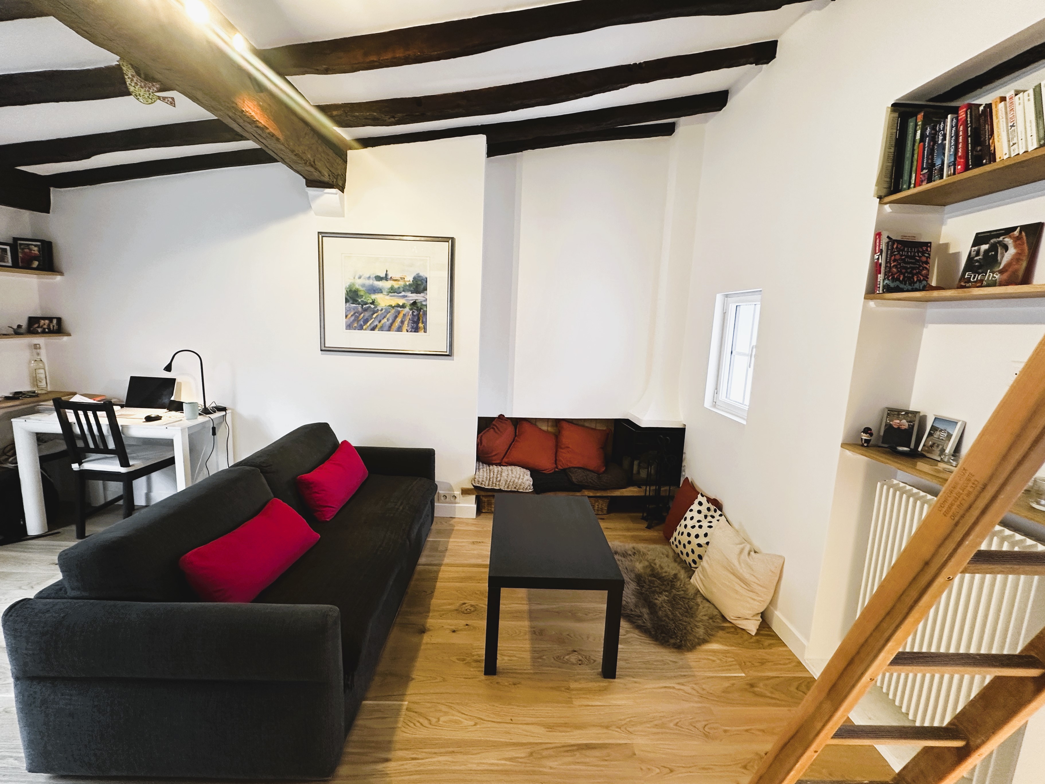 Typically Parisian, the apartment features exposed wooden beams, wooden flooring, and terracotta tiles, creating a warm and authentic atmosphere.