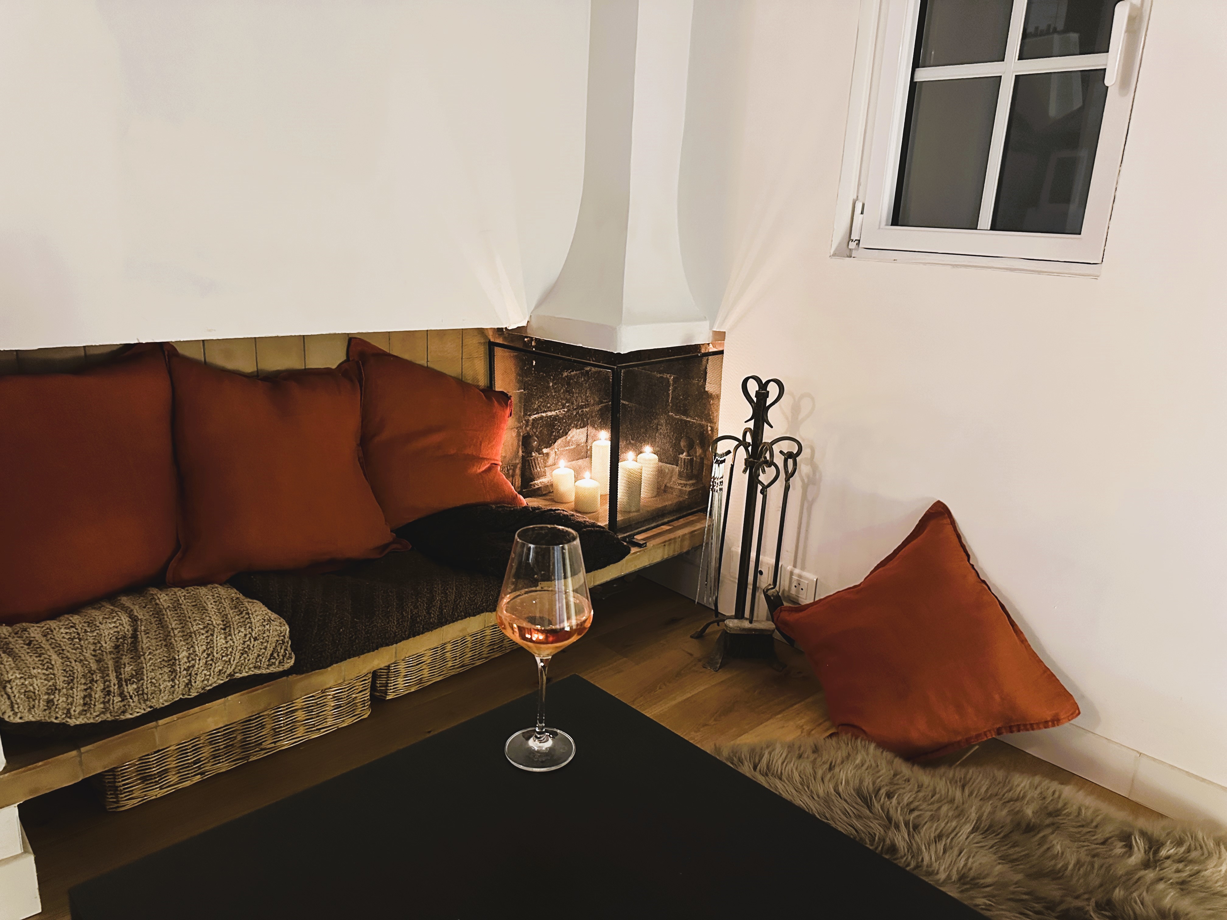 An additional cosy seating area, arranged near the decorative fireplace, creates a pleasant space to relax.