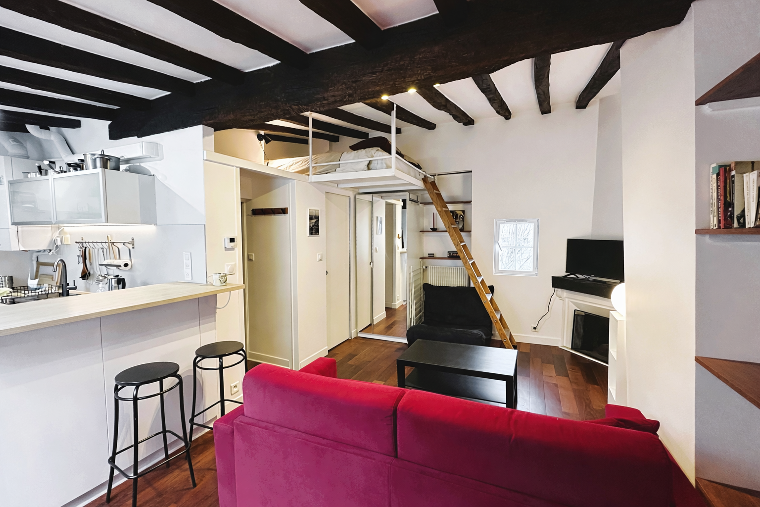This 2BR apartment of 73m² is located in the heart of Paris, at one step from the Forum des Halles and the National Centre of Art and Culture Georges Pompidou, on the 2nd floor walk up, rue du Grenier Saint Lazare, in the 3rd arrondissement.