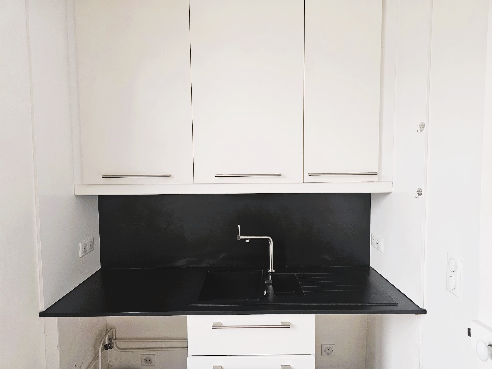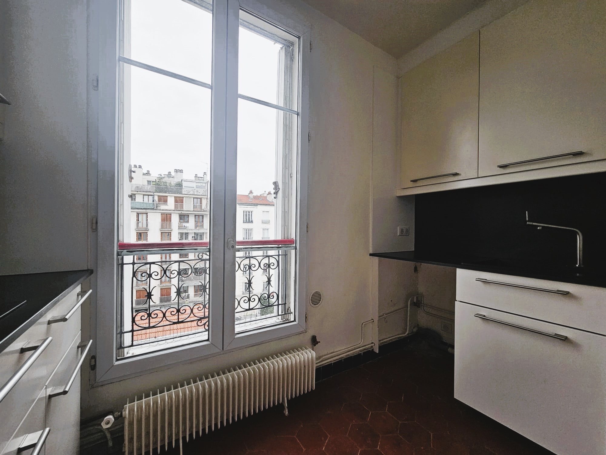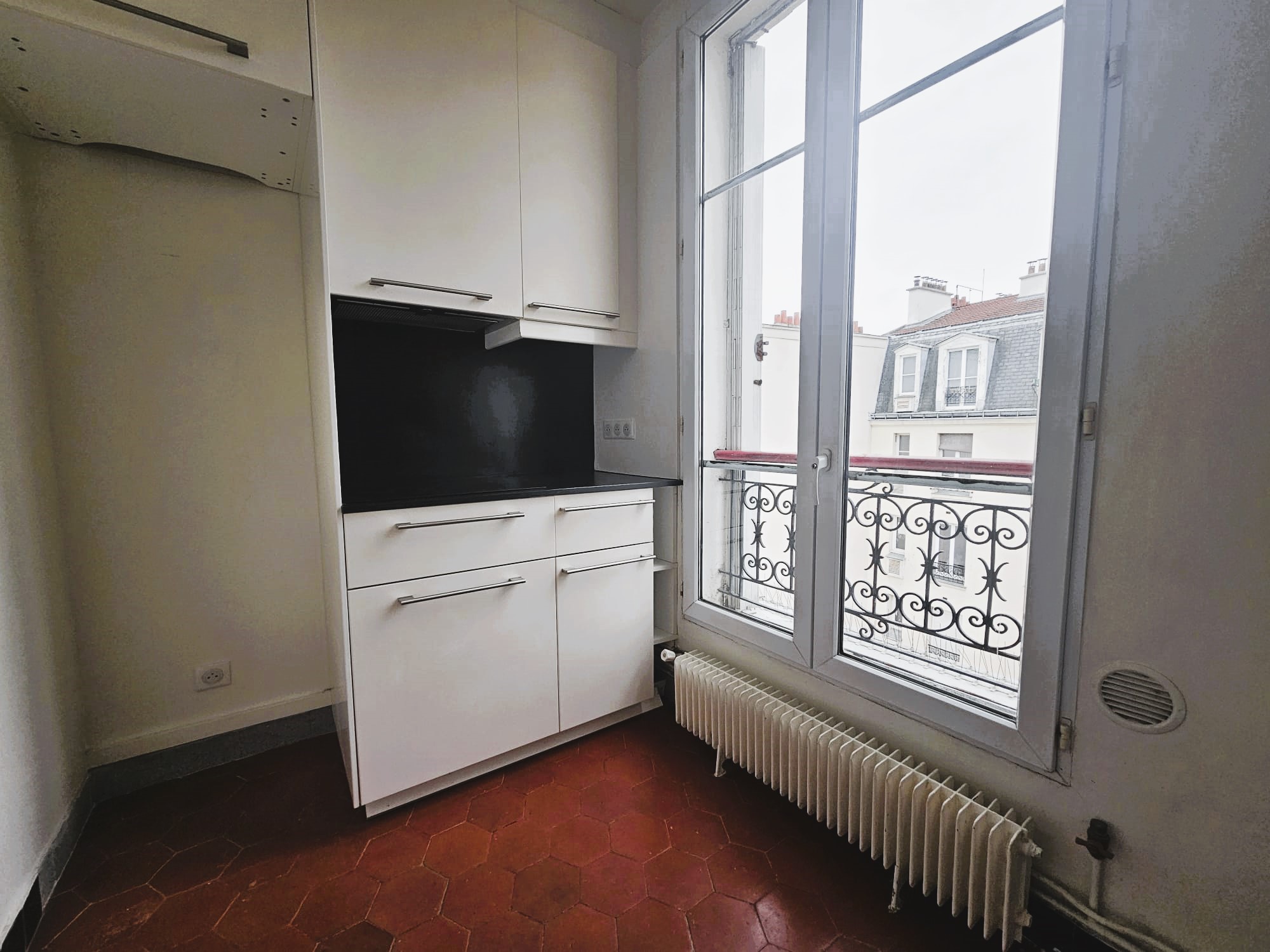 La cuisine séparée (carrelage au sol / double vitrage), fonctionnelle, donne également sur rue. Elle est équipée de rangements, d’un évier, de plaques de cuisson et d’un réfrigérateur. Un emplacement est prévu pour un lave-linge.