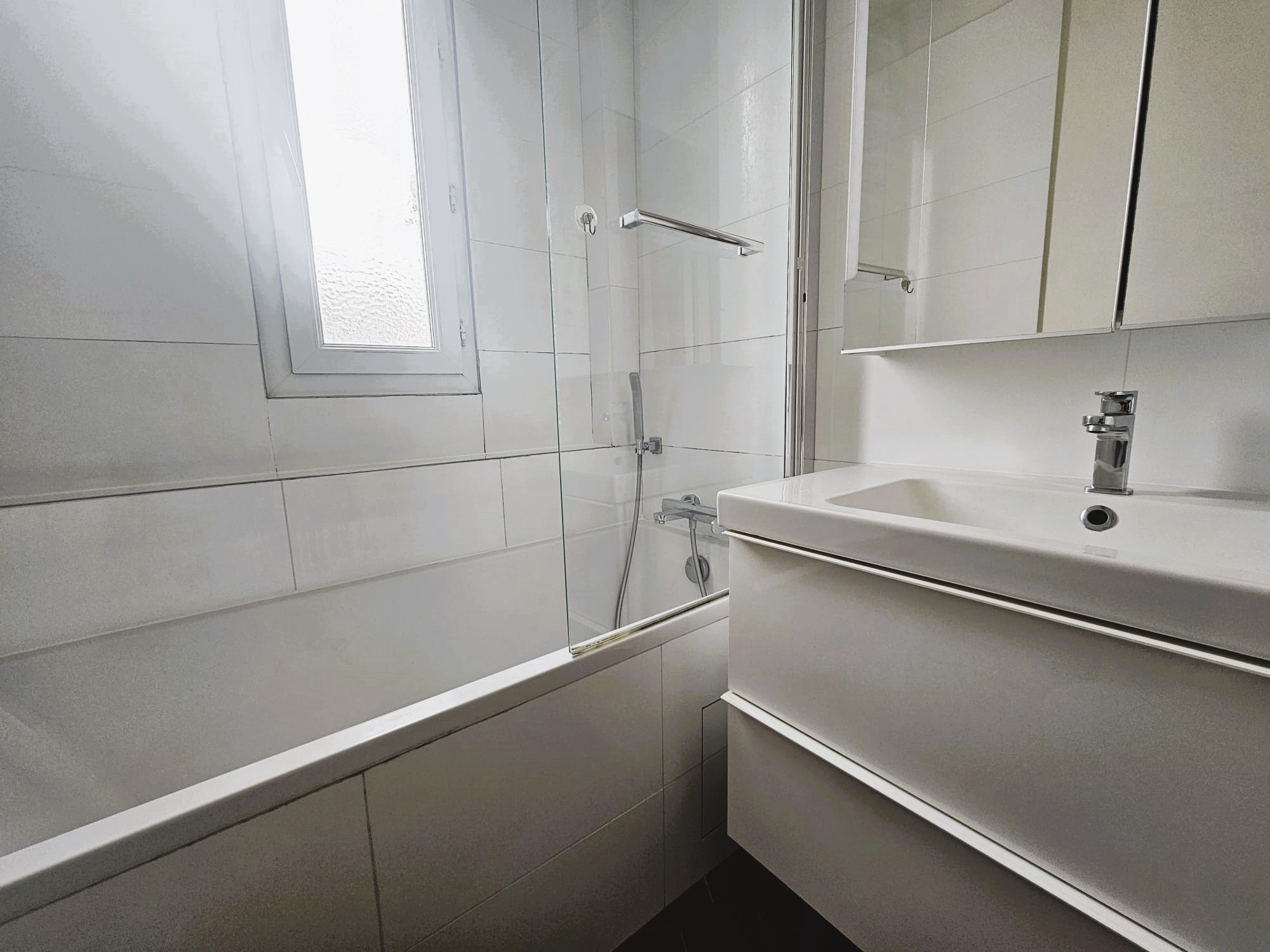 La salle de bain comprend une baignoire avec pare-douche, un meuble vasque et des rangements.